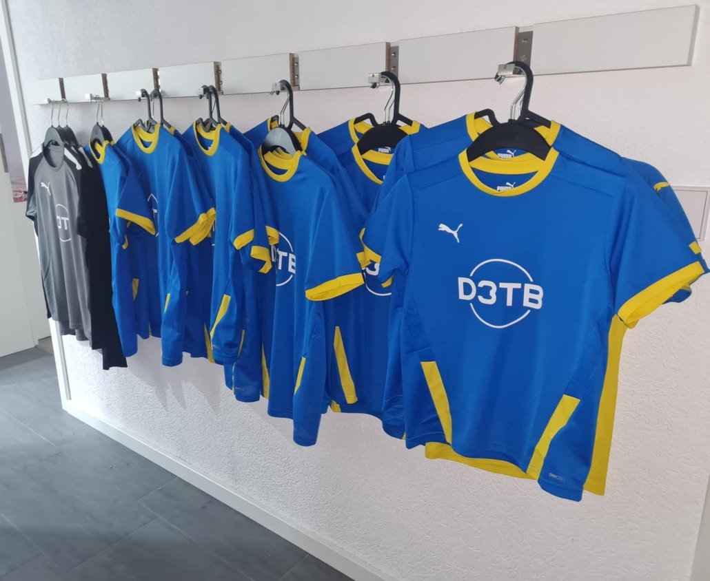 Auf der Brust der nagelneuen Shirts prangte übrigens nicht „Trigema“, „Telekom“ oder „Jobrad“, sondern „D3TB“ für „Die 3 Typen bauen“. Vielen Dank an Uli Keidel und seine zwei Geschäftspartner für dieses Sponsoring des Jugendsports.