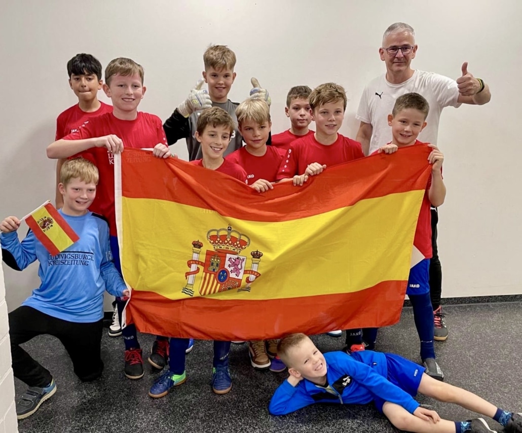 Und so kam es, dass unsere E1 das große Los unter den 24 teilnehmenden Mannschaften zog und unter der Flagge des amtierenden Europameisters Spanien an den Start ging. Ein wenig Kopfzerbrechen bereitete vorweg noch die Frage, ob man vor den einzelnen Spielen zum Singen der spanischen Nationalhymne antreten müsste. Eine kurze Recherche brachte dann ans Licht, dass König Felipe VI. seinen Untertanen keine Sangeskünste abverlangt – man verzichtet bei der Hymne auf einen Text. Auch die mitgereisten Fans zeigten sich erleichtert, dass man sich mit „Spanien vor“ und „Olé“ beim Fähnchen schwenken begnügen durfte.