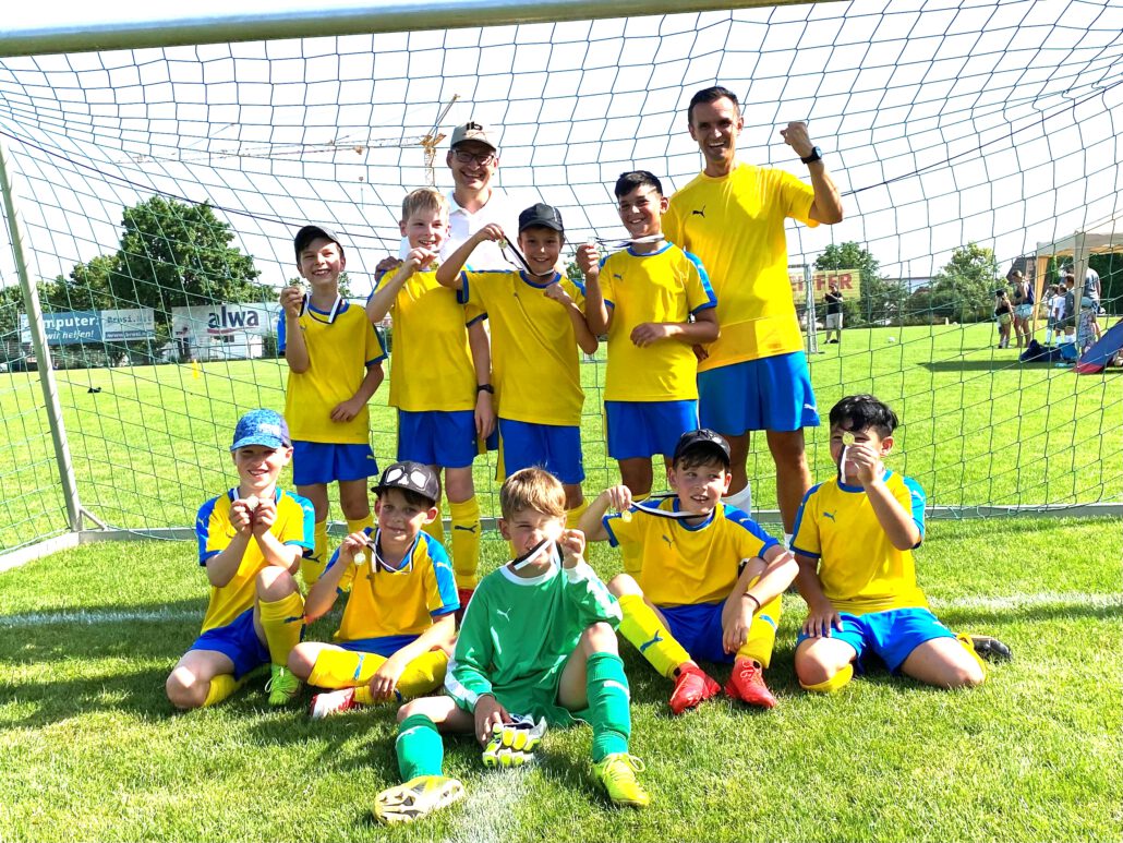 Bei 5 Spielen x 10 Minuten konnten sich unsere 2013er Junioren beweisen. Die ersten zwei Spiele haben wir zögerlich angefangen und mussten wir uns mit 1:0 und 2:1 geschlagen geben. Im 3.Spiel konnte sich die Kicker kontinuierlich steigern und sind mit einem Unentschieden, 3:3, vom Platz gegangen. Das 4. Spiel haben die Jungs mit einem 1:2 verdient gewonnen und haben für das 5. und letzte Spiel bei 35Grad all ihre Kraft zusammengesammelt und konnten torreich nach einem 2:5 als Sieger vom Platz gehen.