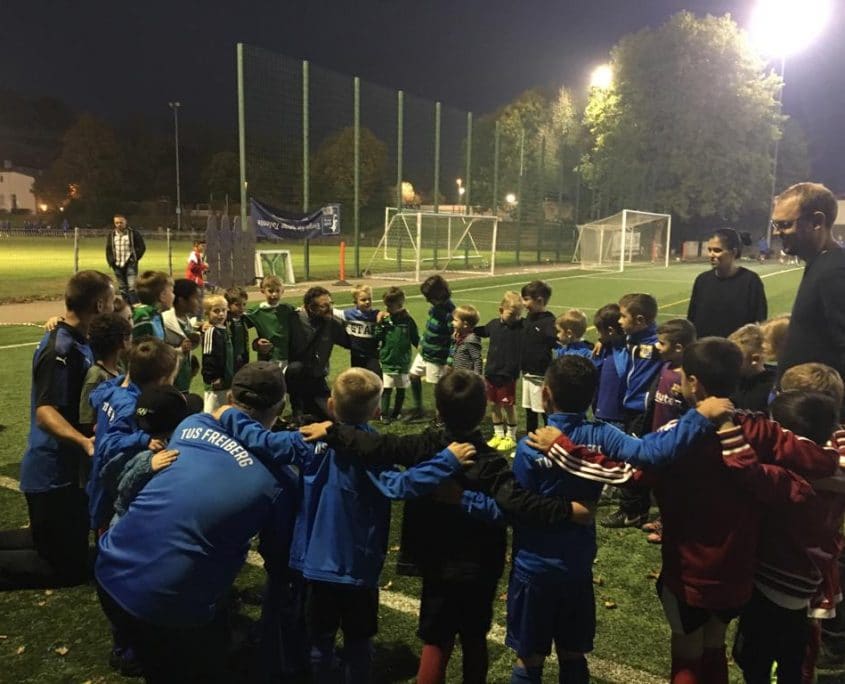 Am Freitag, den 19.10.2018 hatten wir den FV Markgröningen zu Gast auf dem heimischen Kunstrasen am Wasen. Unsere neu gewonnen Freunde kamen zu unserer Trainingszeit zu uns. Wir absolvierten vier Spiele zu je 20 Minuten. Jedoch wählten wir dieses Mal die Variante nach 10 Minuten eine kleine Pause inklusive Seitenwechsel einzulegen. Die Trainer setzten an diesem Tag auf viele Spielmöglichkeiten für die Kinder. So wurde neben dem F-Jugendfeld für das 4+1 Spielsystem noch ein Kleinstspielfeld aufgebaut, vergleichbar wie der Tag beim FV Ingersheim. Die Trainer rotierten auf allen Positionen. Dies hatte zum Beispiel zu Folge, dass unser eigentlicher Linksaußen-Stürmer Calvin als Tormann es schaffte, den Fußball nach Sepp Maier minier im Tor vom FV Markgröningen zu versenken. Die Trainer achteten darauf, dass alle Spieler die an diesem Tag im Training waren, auf dem großen Spielfeld Ihr Können unter Beweis stellen konnten. Dadurch hatten allen Spieler Spaß und waren nach dem Training sichtlich erschöpft. In einem großen Kreis der die beiden Trikotsfarben grün und blau schmückte, verabschiedeten sich die Mannschaften mit dem jeweiligen Schlachtruf.