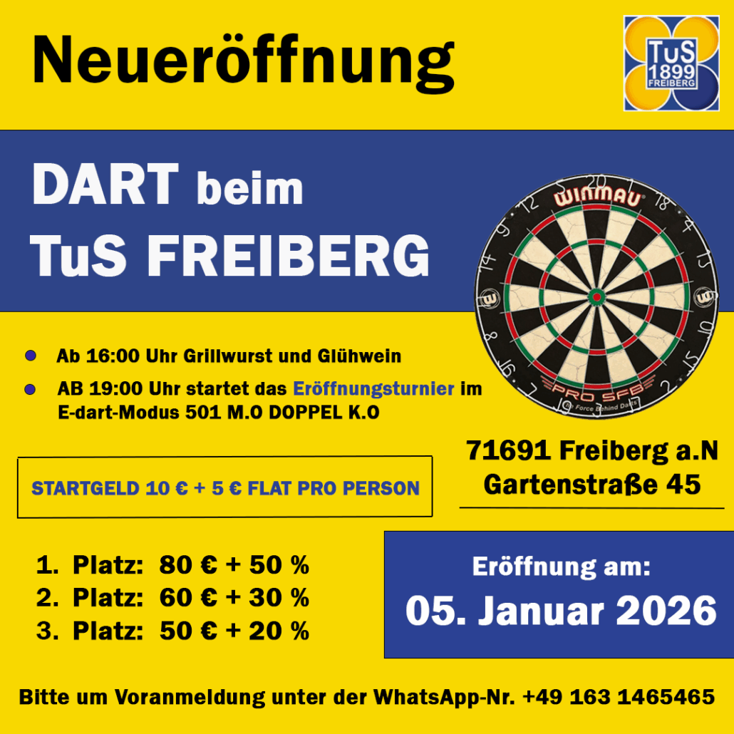 Wir laden hierzu alle Bürgerinnen und Bürger zur feierlichen Eröffnung ein. Am 5. Januar 2026 wird die alte Geschäftsstelle des TuS Freiberg zum Treffpunkt für Dartbegeisterte, Neugierige und Freunde der Geselligkeit.