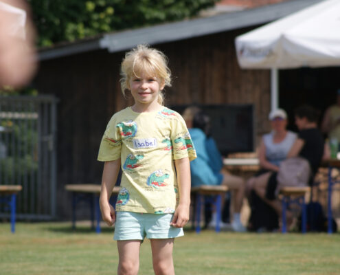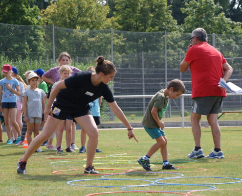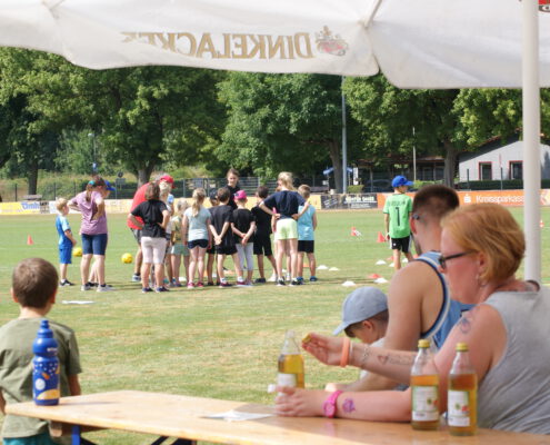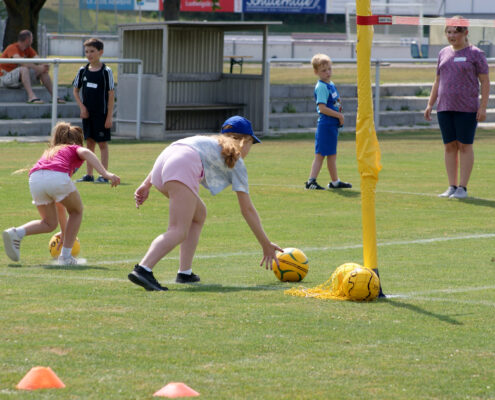 Faustballer hechten schnittig, sprinten schnell und springen hoch! Entsprechend wild ging es am Samstag auf dem Freiberger Wasen zu. Die quicklebendigen Faustball-Kids gaben alles und navigierten zwischen Ringen, Hütchen und Bällen. „Vor allem hinter den Ball stehen, das ist wichtig, wenn er auf dich zufliegt“, weiß Lucia, „der kann nämlich ganz schön lustig aufspringen“. Das kennt auch Faustball-Trainerin Vanessa und lacht „sich richtig hinter den Ball zu bewegen, das üben wir natürlich im Kindertraining. Das übt auch manch ein Erwachsener noch“.
