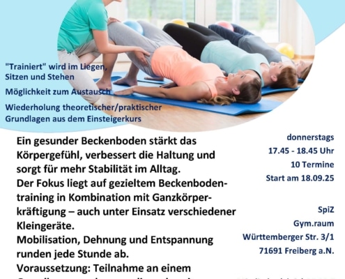Aktuelles, Newsletter-2.BeitragEin gesunder Beckenboden stärkt das Körpergefühl, verbessert die Haltung und sorgt für mehr Stabilität im Alltag. Der Fokus liegt auf gezieltem Beckenboden- training in Kombination mit Ganzkörper- kräftigung – auch unter Einsatz verschiedener Kleingeräte.