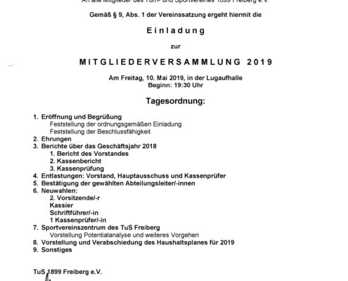 AktuellesAm 10.05.2019 fand am Abend die diesjährige Jahreshauptversammlung des TuS 1899 Freiberg e.V. statt. Aufgrund längerfristiger Erkrankung des ersten Vorsitzenden Eberhard Müller,
