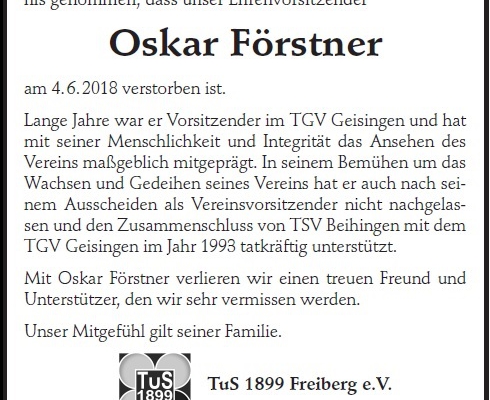 Ehrenvorsitzender Oskar Förstner ist verstorben
