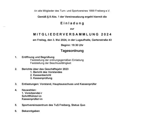 Aktuelles, Newsletter 1. BeitragDer TuS 1899 Freiberg e.V. lädt am 05. Mai 2023 zu seiner jährlichen Mitgliederversammlung ein. Sie findet in der Lugaufhalle ab 19.30 Uhr statt.