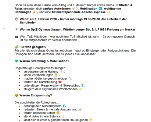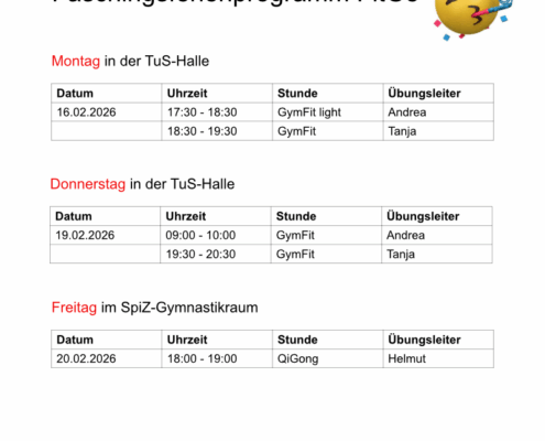 GymnastikAm 18.11.2023 stellten sich einige Übungsleiter der Abteilung FitGe (Fitness und Gesundheit) des TuS Freiberg allen interessierten Mitgliedern und Gästen in einem Rahmenprogramm von jeweils 30minütigen Mitmachaktionen vor.
