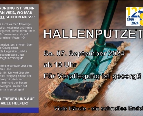 Aktuelles, Newsletter-3.BeitragAm Samstag, den 07. September 2024, findet die diesjährige Hallenputzete der TuS-Halle statt. Hierfür werden freiwillige Helfer gesucht, welche ab 10 Uhr mithelfen die TuS-Halle einer jährlichen Grundreinigung zu unterziehen. Wir sind dankbar über alle Helfer, die uns auch für das nächste Jahr eine saubere Halle ermöglichen.