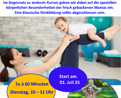 Im Gegensatz zu anderen Kursen gehen wir dabei auf die speziellen körperlichen Besonderheiten der frisch gebackenen Mamas ein.