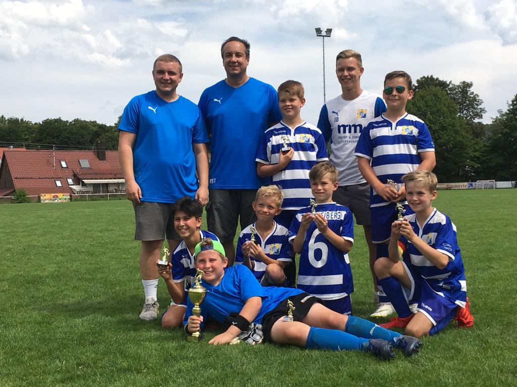 Bei der E3 musste Trainer Matze im Tor improvisieren und so musste jeder der 10 Jungs mindestens einmal ins Tor. In der Gruppenphase zeigten die Jungs einige gute Ansätze, konnten aber spielerisch und läuferisch noch nicht ganz mithalten und brachten sich das ein oder andere Mal durch einfache Fehler selbst auf die Verliererstraße. Die Mannschaft überzeugte trotzdem durch ihr mannschaftliches Auftreten und holte sich im letzten Spiel noch einen verdienten 5:2-Erfolg und schloss das Turnier auf Platz 11 ab.