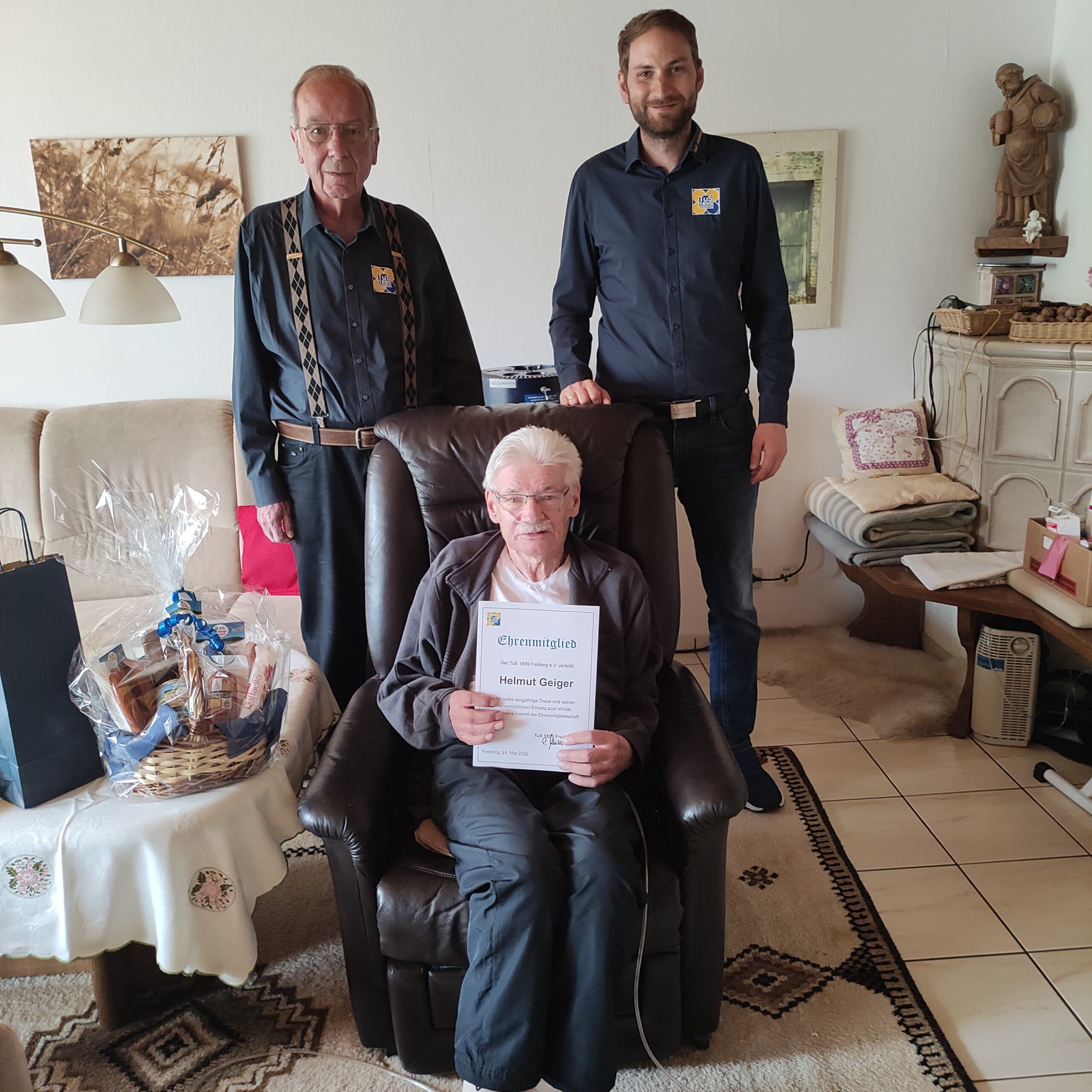 Helmut Geiger wurde vom Hauptausschuss des Vereins auf Vorschlag des Vorstandes einstimmig zum jüngsten Ehrenmitglied ernannt. Corona bedingt konnte die Ehrung nicht in der letzten Mitgliederversammlung vorgenommen werden und deshalb, aber auch mit Rücksicht auf seinen angegriffenen Gesundheitszustand, haben der 1. Vorsitzende und der Geschäftsführer ihn in der letzten Woche besucht und überreichten ihm dabei einen Geschenkkorb im Namen des Vereins.