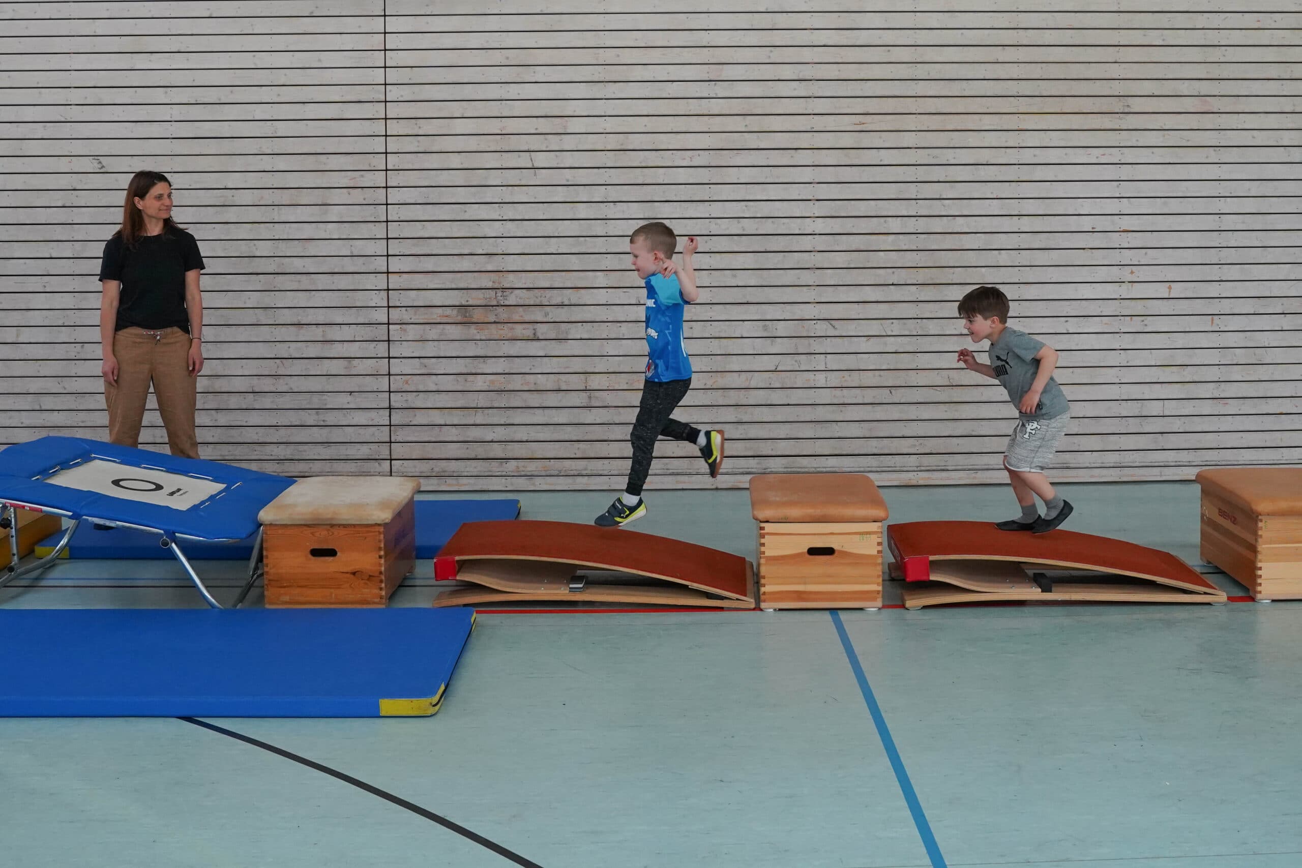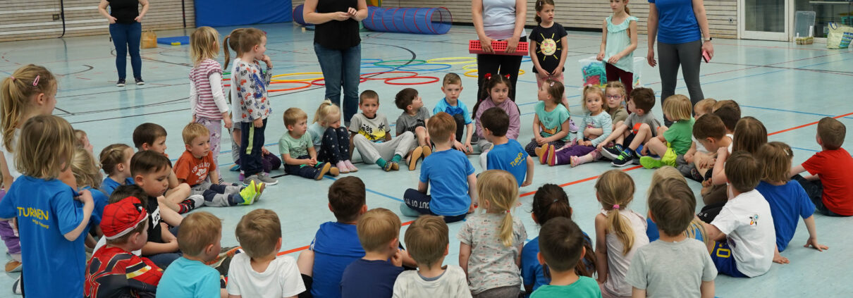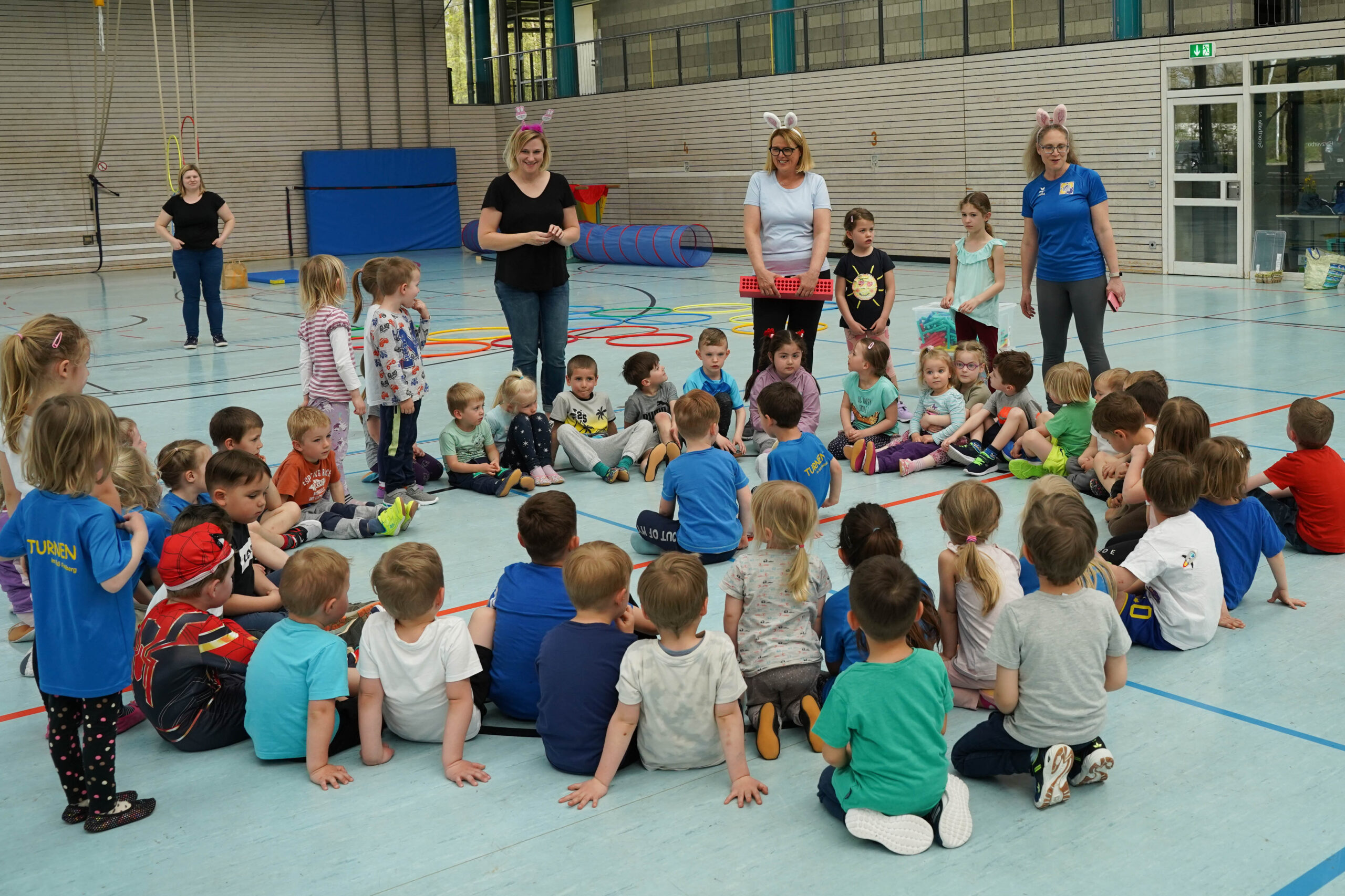 Knapp über 50 Turnkinder im Alter von 4-6 Jahren kamen am Mittwoch, 13. April in die Wasenhalle, um sportlich Ostern einzuläuten. Eingestimmt haben wir uns mit dem „Hasenlied“. Dabei haben wir uns hüpfend und tanzend ganz schön ins Schwitzen gebracht.