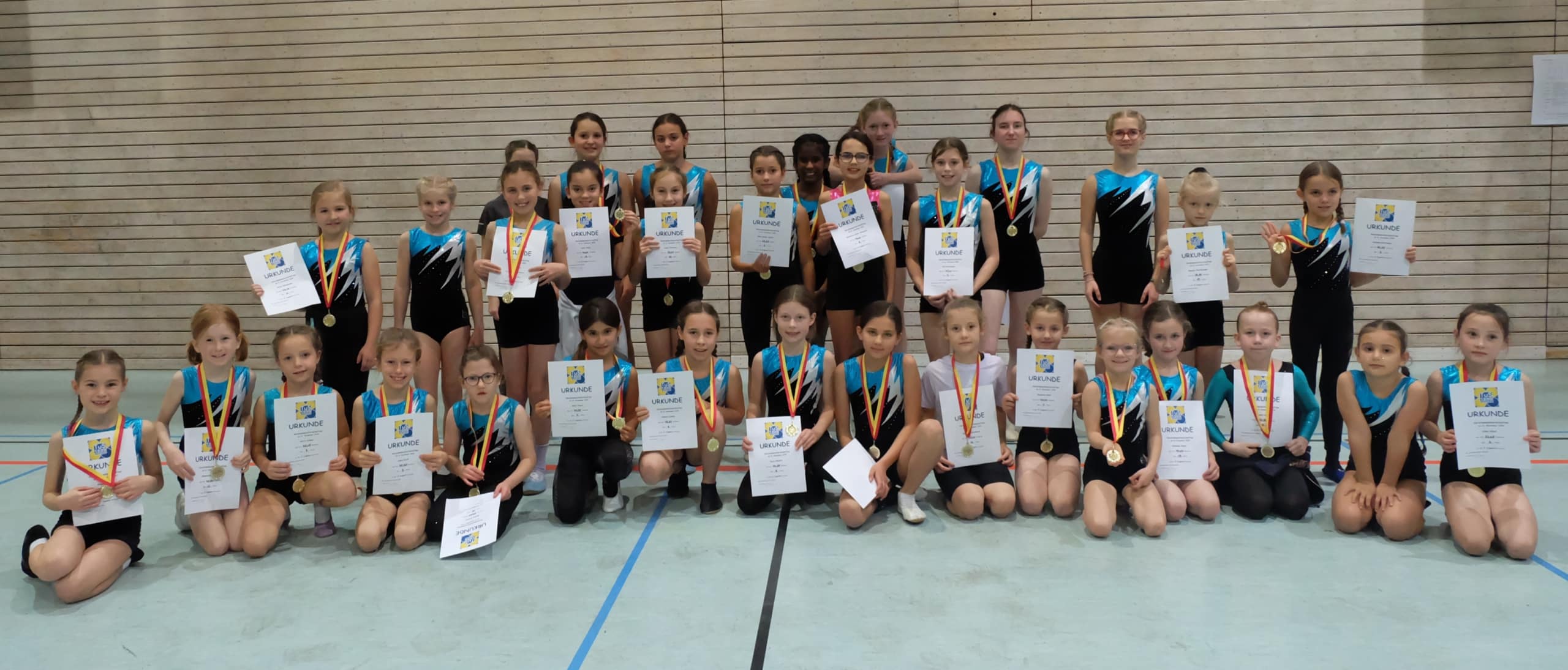 Großgeräten wie Reck, Barren, Schwebebalken, Sprung und Boden erlernt.