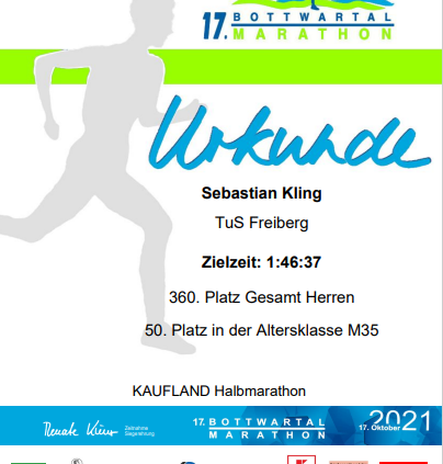 Sebastian Kling, Leiter der Mini-Ballschule, hat am 17.10.2021 beim Bottwartal Marathon den Halbmarathon in einer Zeit von 1:46:37 zurückgelegt.