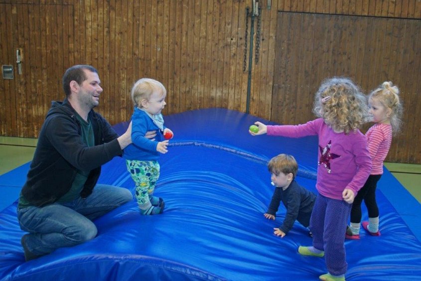 Zu Beginn gibt es einen gemeinsamen Start mit Bewegungsliedern. Danach können die Kinder ihren Bewegungsdrang ausleben, Krabbel- und Lauferfahrungen sammeln und sich mit den Eltern an altersgerechte Gerätelandschaften heranwagen. Im Mittelpunkt steht die Erfahrung erster koordinativer Fähigkeiten (krabbeln, laufen, klettern, balancieren, rollen, hüpfen, schwingen, etc.).